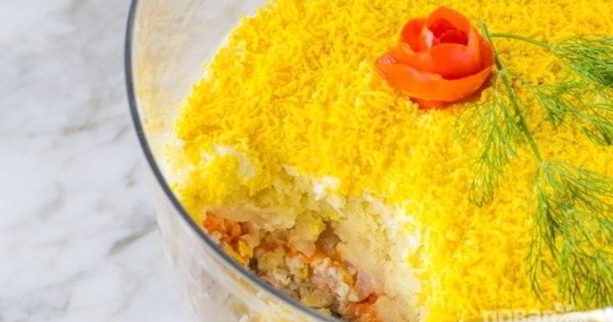 Сразу уточню, что это не тот вариант мимозы, который принято считать «классическим»( с кусочками сливочного масла и сайрой), а тот, который мой любимый.