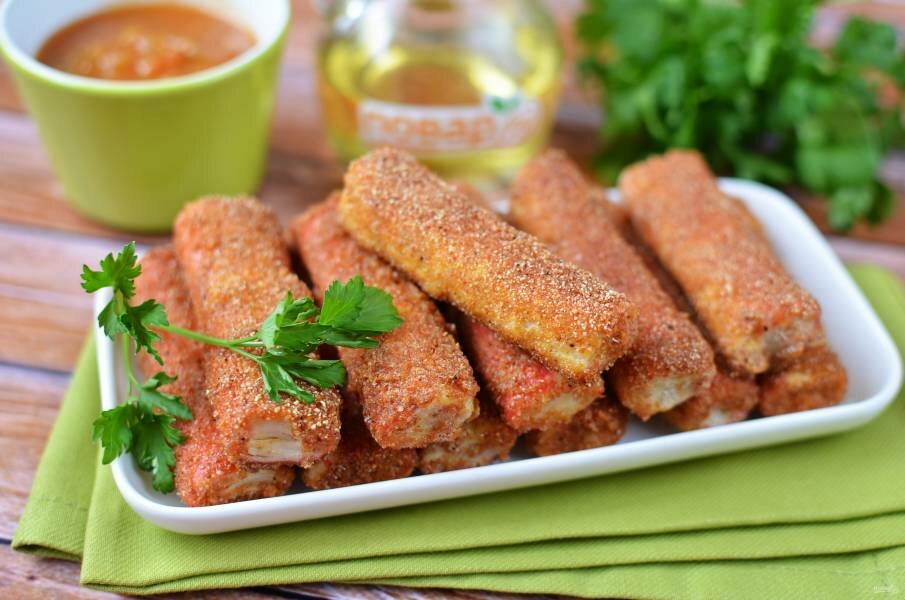 Это отличный вариант для большой компании, когда нужно быстро накрыть на стол. Палочки хорошо сочетаются с пивом, но подойдут и к вину.