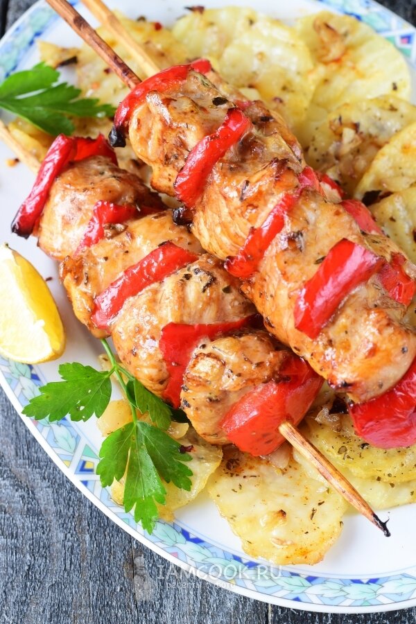 На картошку кладем шпажки с нанизанными кусками свинины и отправляем форму запекаться в духовку, разогретую до 200 градусов.