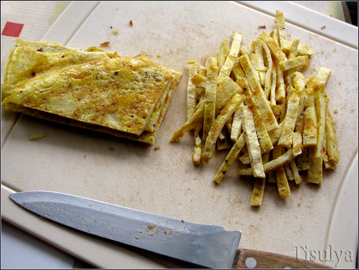 Остудив, нарезаем блинчики тонкими ломтиками (по размеру примерно как мясные кусочки).