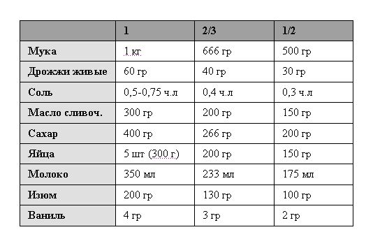 ИТАК: (ингредиент весовая часть) мука 1 кгвода 2/5 от веса мукидрожжи свежие или сухие 3% (1% сухих) от веса мукимасло 50 г на 1 кг мукияйца примерно 2 штсахар 3 ст ложкисоль 1 ч ложка