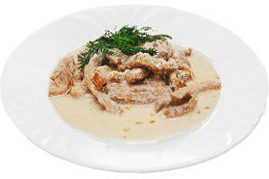 Он состоит из мелко нарезанных кусочков мяса, залитых горячим сметанным соусом.