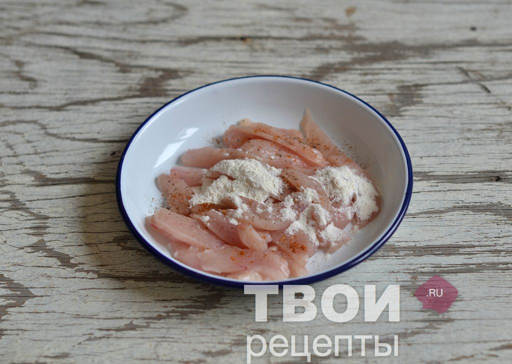 Затем нарежьте куриное филе толстыми брусочками.