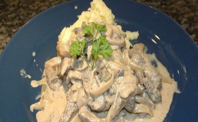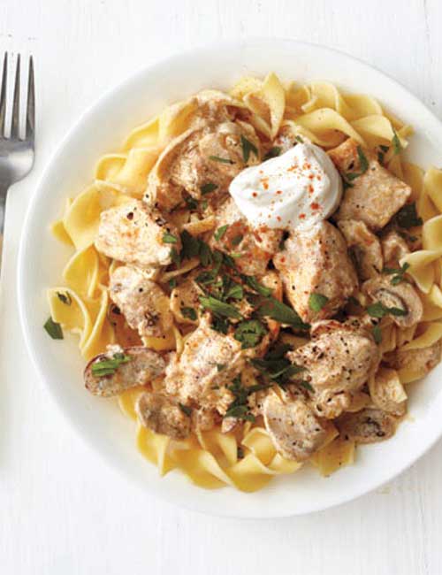 Снимите с огня и добавьте сметану. Попробуйте на соль и перец и отрегулируйте соответственно. Подавать с горячей вареной яичной лапшой, рисом или картофельным пюре.