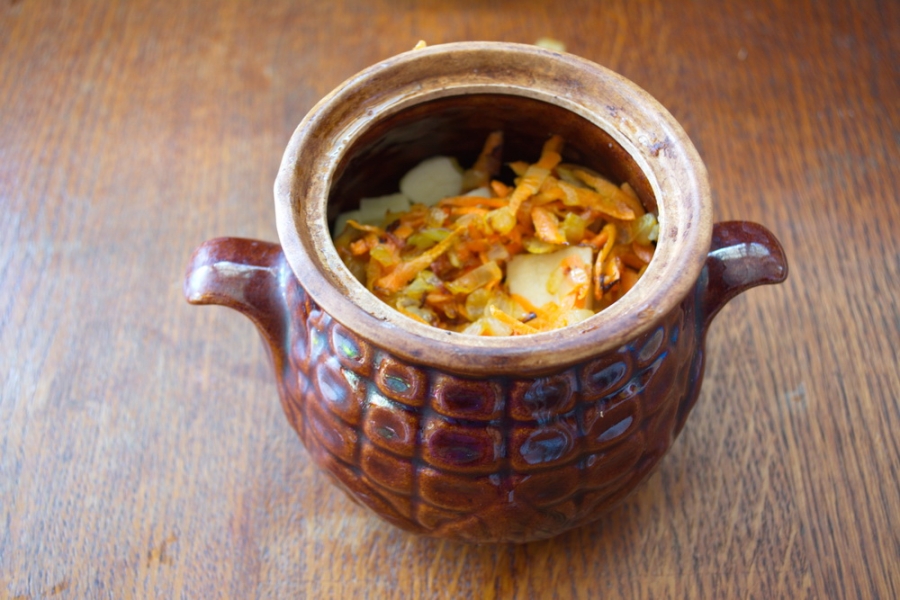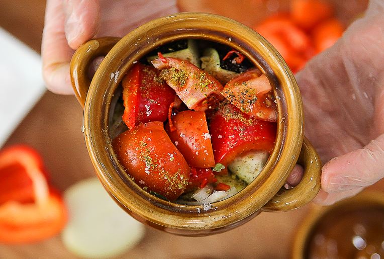 На дно немного разогретых горшков укладываем по небольшому кусочку бараньего жира, под воздействием высокой температуры он растопится и не даст пригореть содержимому горшочков. Сверху кладем лук, чеснок, баклажаны, фасоль и картофель. Теперь наступает черед мяса. Кусочки баранины укладываются плотным слоем в центр горшочка. Следом идут четвертинки сладкого, сочных красного и желтого перцев, половинки помидора. Затем добавляем перец-чили и аджику. Лучше всего чтобы все время нарезания и укладывания овощей горшочки для чанахи разогревались на плите.