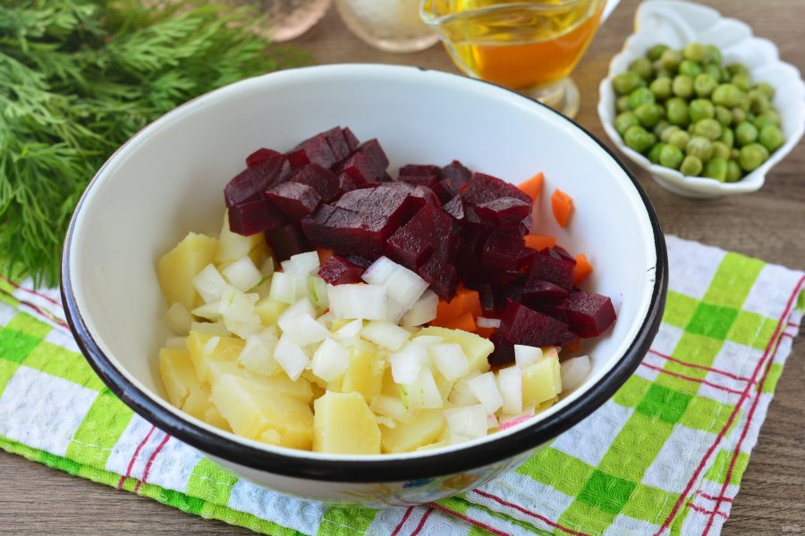 Приготовить винегрет, рецепт обычный с горошком, как у бабушки, чтобы свекла не красила винегрет довольно просто.