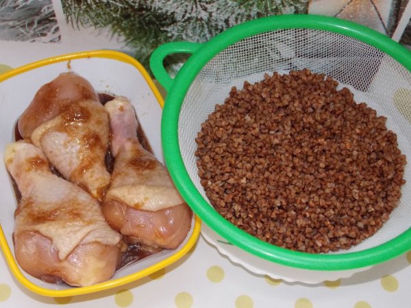 9. Горшочек у меня большой (можно брать несколько маленьких) выкладываю на дно обжаренную гречку.