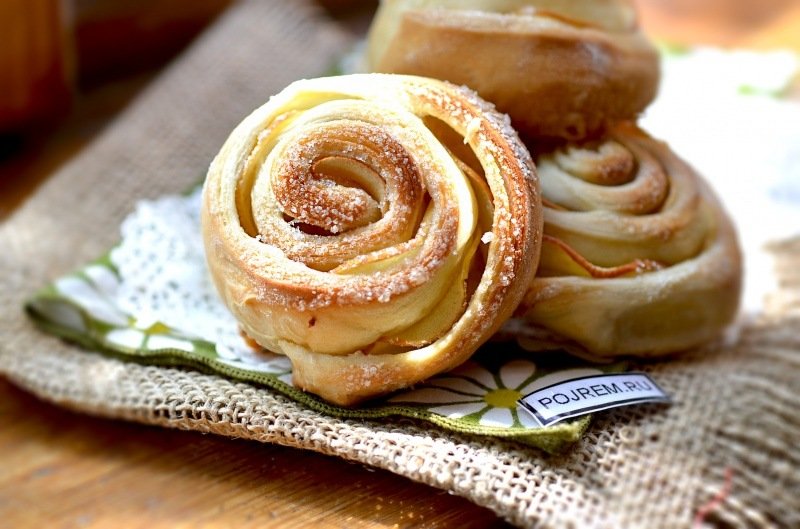 На сайте уже есть рецепты яблочных роз из слоёного теста и наших любимых творожных розочек , которые я ещё в детстве научилась печь от своих мамы и бабушки.