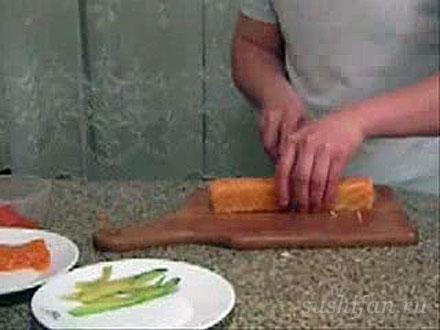 Ну вот, дорогие читатели, мы подошли к третьему способу нарезки филе рыбы. И мы Вас уверяем, что этот способ — прост! Не нужно крутить — вертеть филе, резать его пополам, а всего лишь обрезать края филе рыбы и нарезать его длинными кусочками вдоль всего куска рыбы. Толщина отрезанной полоски рыбы, как и для нигири — от 5 до 10 мм. Не удивляйтесь длине полученной полоски, роллы все равно не будут такими длинными 🙂 Длину нарезки Вы будете регулировать сами, в зависимости от длины нори ( примерно от … до 18-20 см). Хотя Вы можете попытаться побить мировой рекорд — «самый длинный суши ролл», который был установлен в 2006 году в Японии, городе Шизуока.
