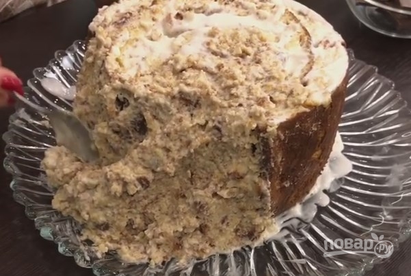 Разъёмную форму диаметром 20-22см застилаем пищевой плёнкой. Дно и бока смазываем кремом. Каждый кусочек рулета окунаем в крем, плотно укладываем их в форму. Между слоями посыпаем обжаренными измельчёнными грецкими орехами. Получается торт в три слоя. Если используете форму диаметром 20см, то придётся нарастить борт торта бордюрной лентой(или разрезанным канцелярским файлом). Сверху накрываем торт пищевой плёнкой, отправляем в холодильник. Если используете магазинную сметану, то для пропитки понадобятся сутки. Если сметана домашняя, — то торт можно пропитывать до двух суток.
