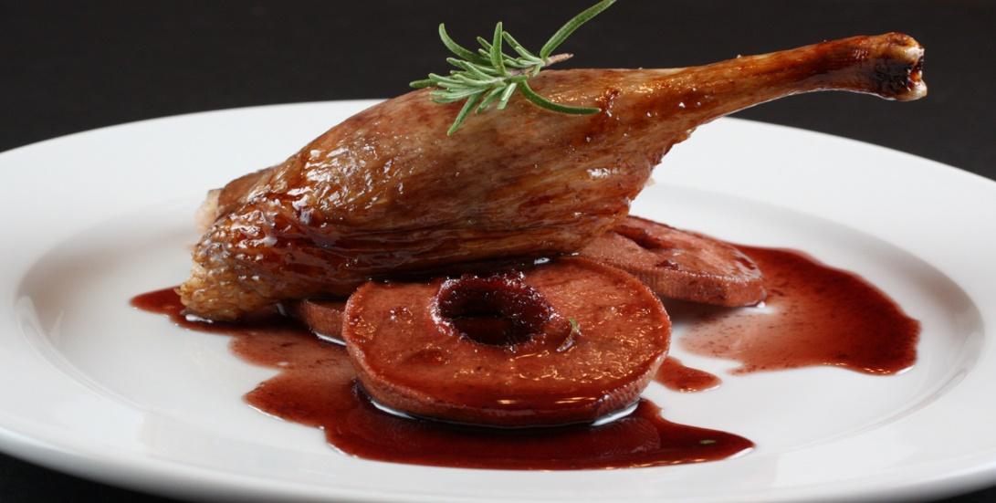 Конфи из утиной ножки с картофельным беконом и карамелизированными яблоками рецепт
