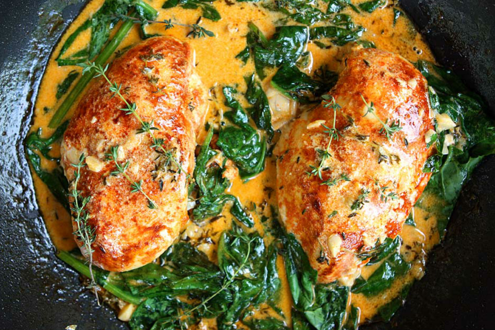 Цыпленок со сливочным шпинатом и красным перцем