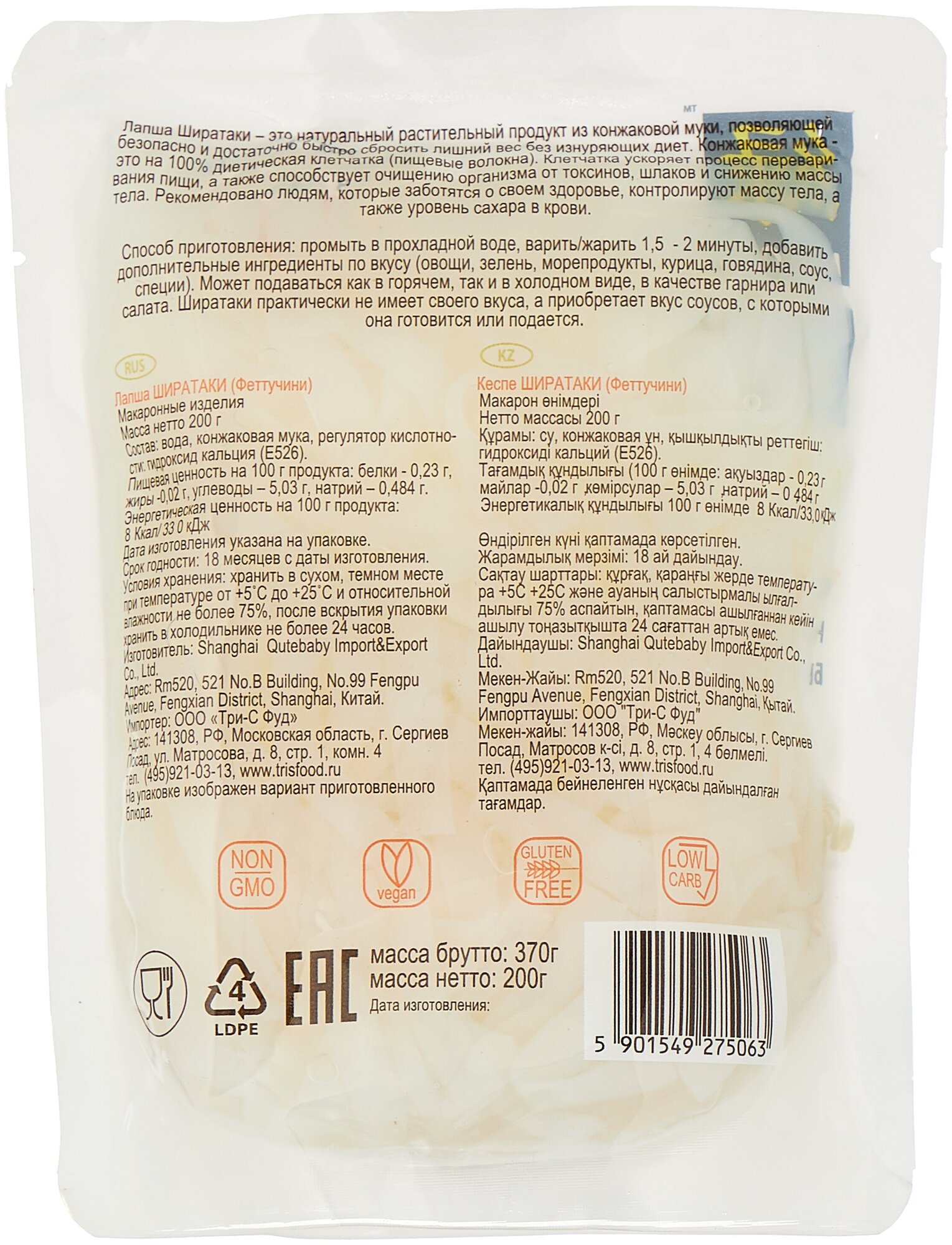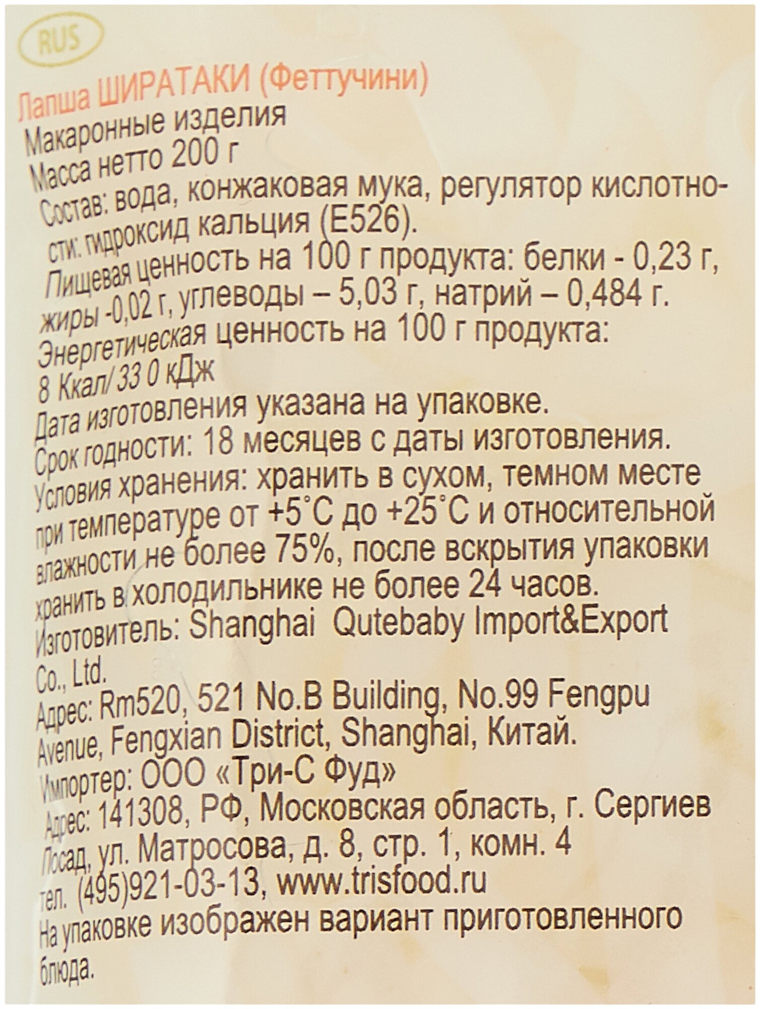 ВЕРМИШЕЛЬ ШИРАТАКИ ВАРИТСЯ, КАК ОБЫЧНАЯ ВЕРМИШЕЛЬ, НО В ОТЛИЧИИ ОТ ОБЫЧНОЙ ВЕРМИШЕЛИ ОНА ТЕРМОУСТОЙЧИВА, ТО ЕСТЬ ОНА НЕ РАЗВАРИВАЕТСЯ И СОХРАНЯЕТ ФОРМУ. КАЛОРИЙНОСТЬ, ПРИ ЭТОМ, ОСТАЕТСЯ ПРЕЖНЕЙ – ВСЕГО 9 ККАЛ НА 100Г!
