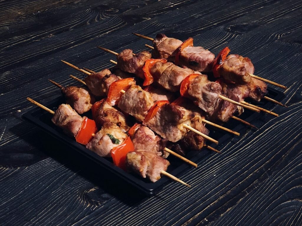 Шашлык из курицы на деревянных шпажках, запеченный в духовке