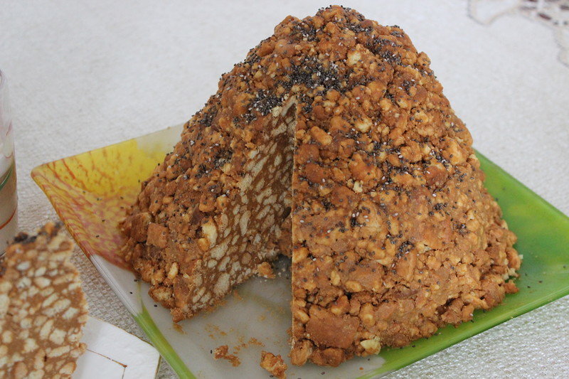 - При желании можно украсить «Муравейник» шоколадной крошкой, тертым орехом или маком – но я принципиально ничем не оформляю, имхо домашний торт должен иметь истинно домашний вид, без допиливания под евростандарты, и поражать прежде всего своим вкусом.
