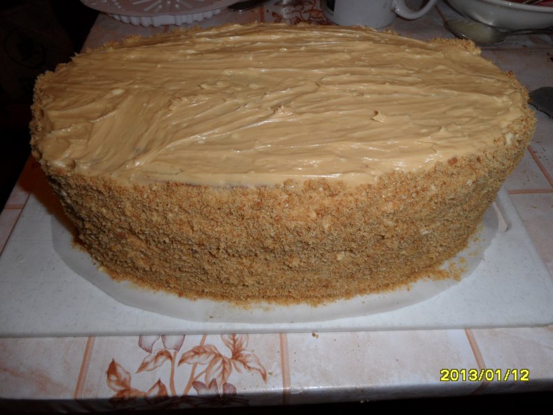 - Приготовленные коржи по очереди смазывают кремом. Поверху торт обсыпают орехами грецкими.