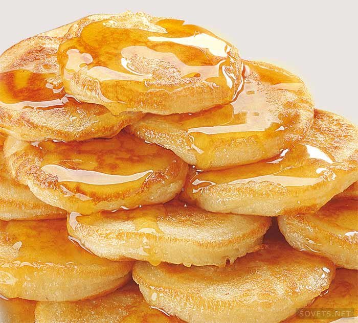 Оладьи готовы, подавать их можно со сгущенным молоком или медом, а можно не отклоняться от лучших традиций школьной столовой и подать их с яблочным повидлом.