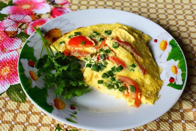 Добавление овощей в омлет повысит его калорийность.Калорийность омлета с овощами составляет около 464 калорий, из них 29,44 грамма белка, 34,88 грамма жира и 8 граммов углеводов.