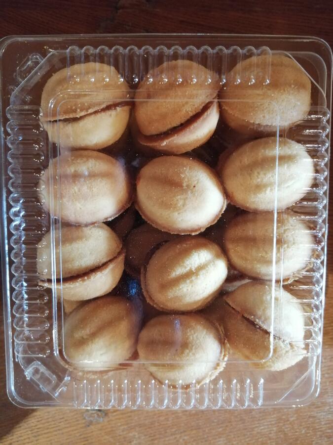 Поставить ее на небольшой огонь и переворачивать орешницу для равномерного пропекания и румяности теста. Для проверки готовности заготовок из теста можно открыть прибор и проверить их состояние. Последующие выпекания будут проводиться быстрее, так как сковорода уже достаточно раскаленная. - Песочные заготовки нужно высыпать на тарелку или деревянную кухонную доску. На данное количество теста обычно выходит около 72 половинок скорлупок ореха. При образовании лишнего теста по краю заготовок нужно его аккуратно обрезать или обломать. Обрезки допускается добавить в крем.