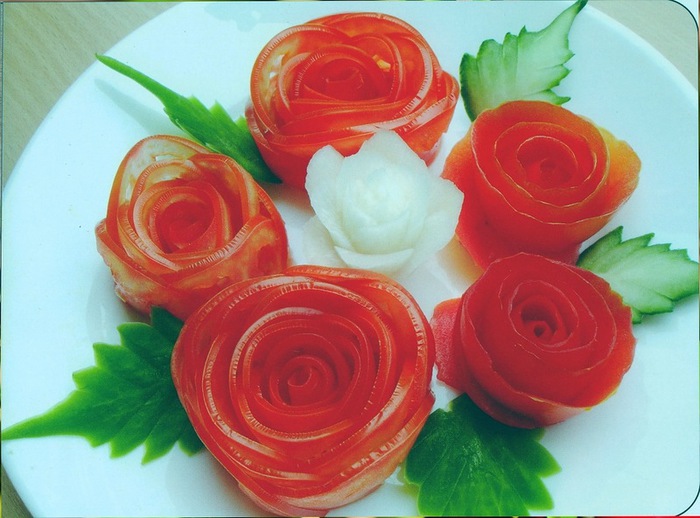 Так можно делать розы не только из помидор, но и из других овощей и даже фруктов. Например, очень удачно выглядят в салате розы из груш (есть такой овощной салатик с грушами — ням-ням!). Можно придумать очень многое. Например, когда-то увидел такое чудо из имбиря. И теперь дома я так оформляю к роллам имбирь и васаби: