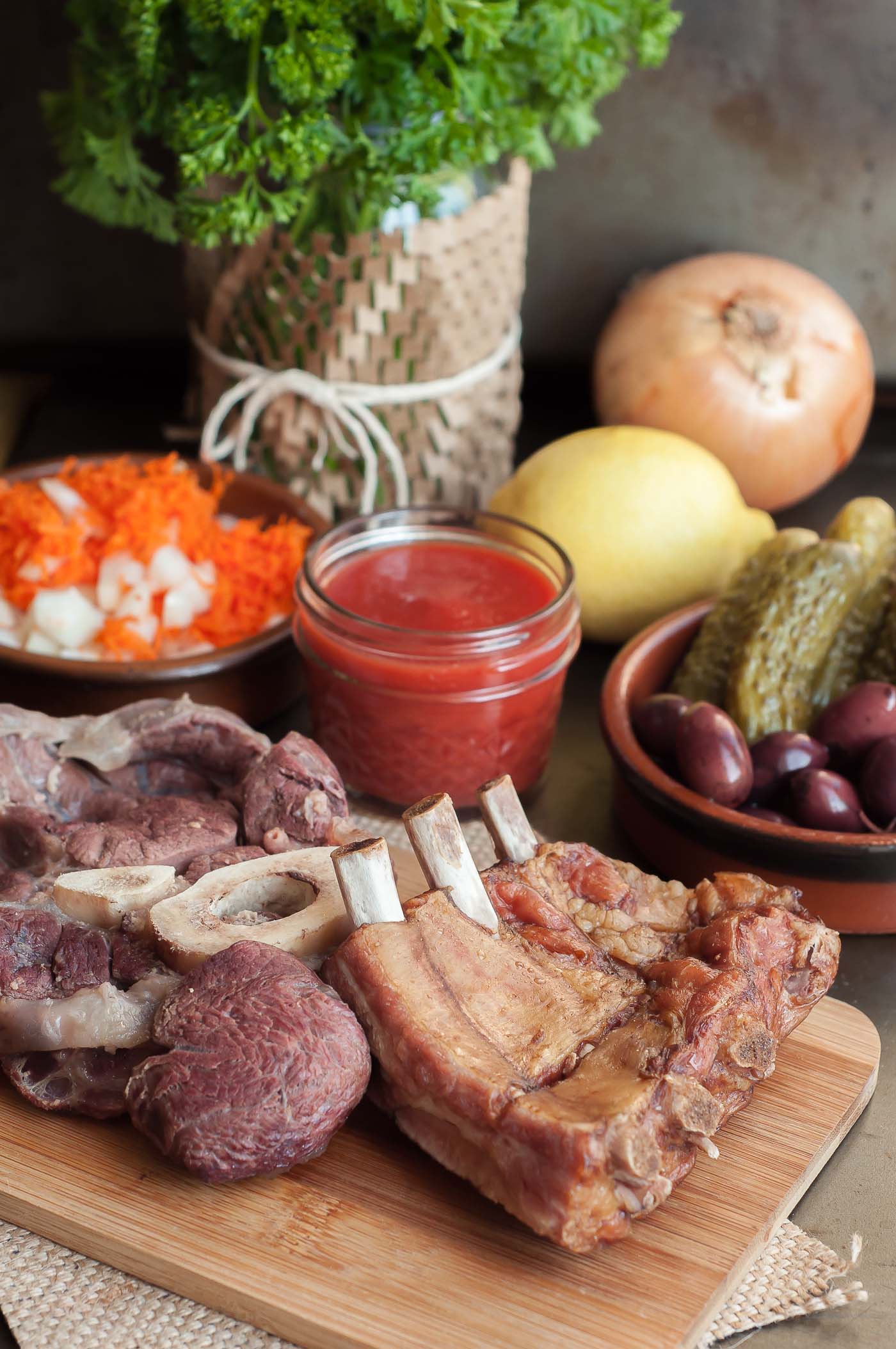 Заранее нужно будет отварить говяжий бульон, просто возьмите кусочки говядины на кости и отварите мясо до готовности, а бульон пойдет на это дело.