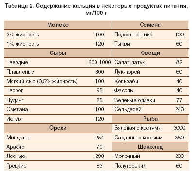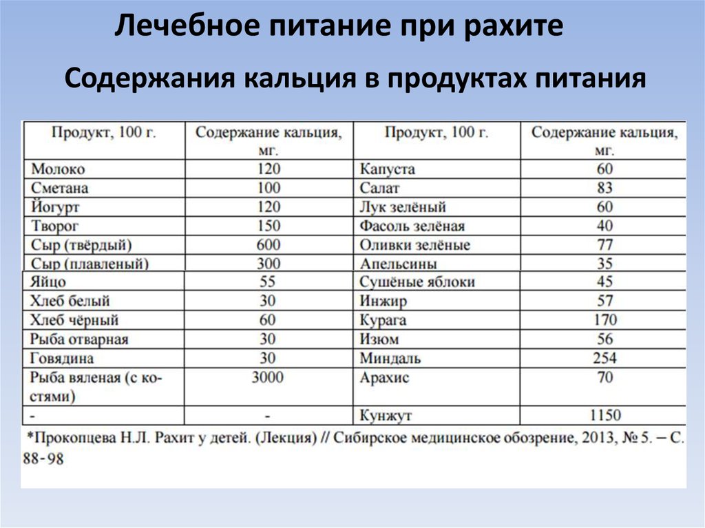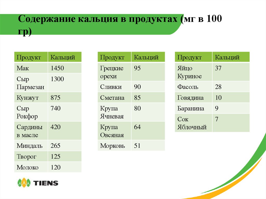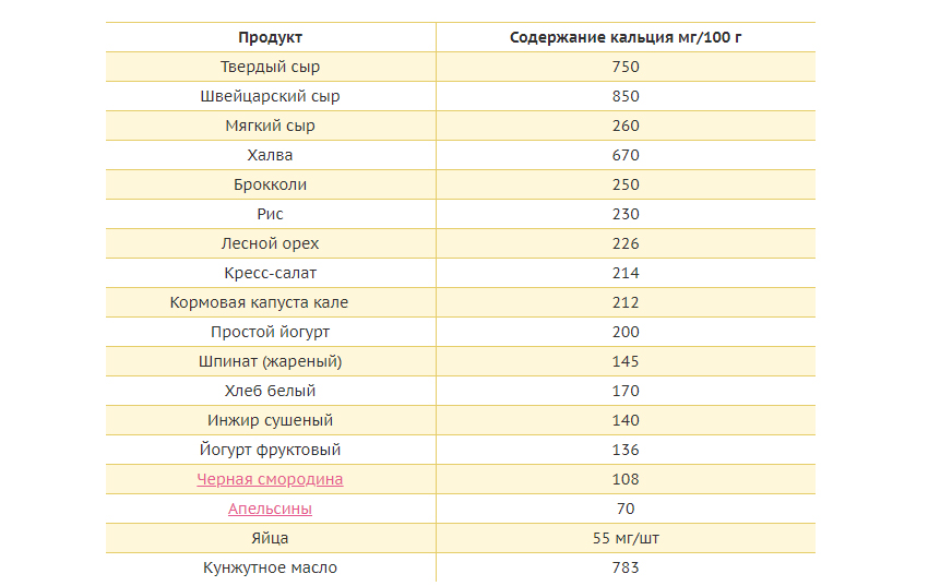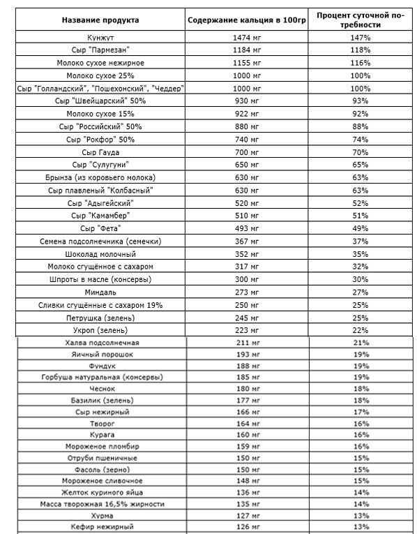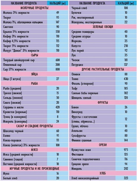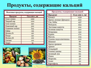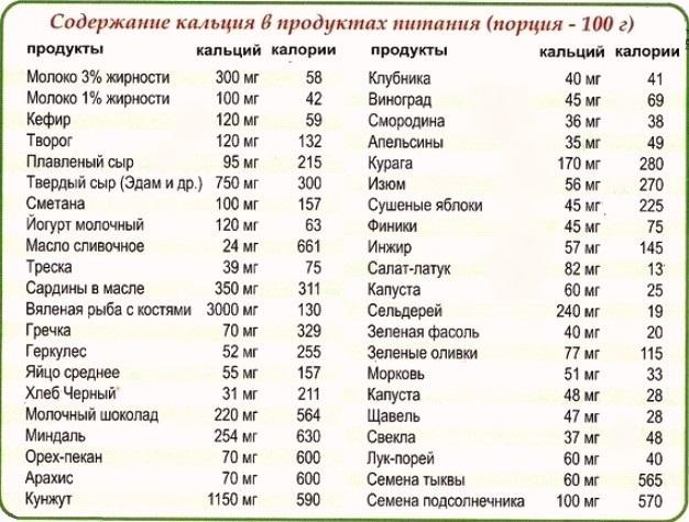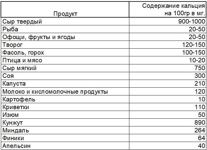 | Продукты питания | Кальций (мг) |