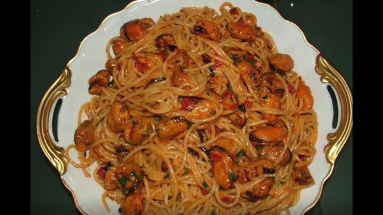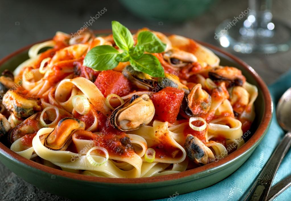 Вкусный рецепт приготовления пасты с мидиями в томатном соусе с белым вином. Мидии готовятся в ракушках.