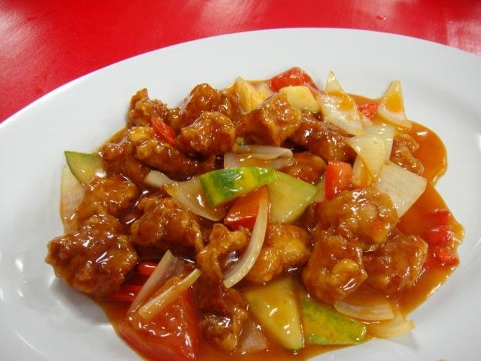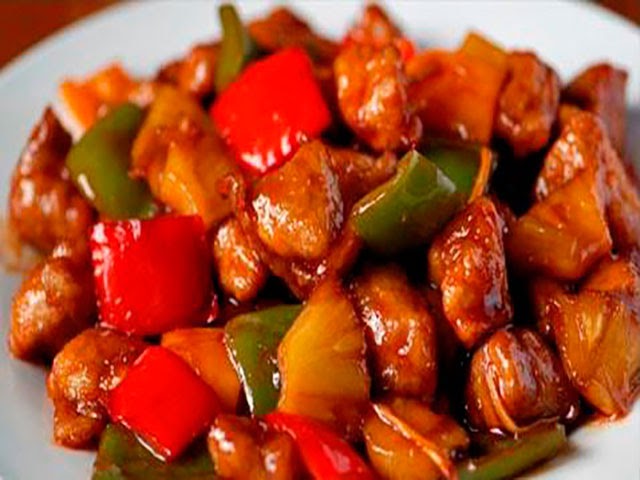 В северных районах Китая мясо кисло-сладкое по-китайски готовят с квашеным огурцом. Его кислота вполне заменяет кислоту ананаса. Если кислотность овощного компонента мала, можно добавить немного кислого рассола. Все овощи режем крупной соломкой.