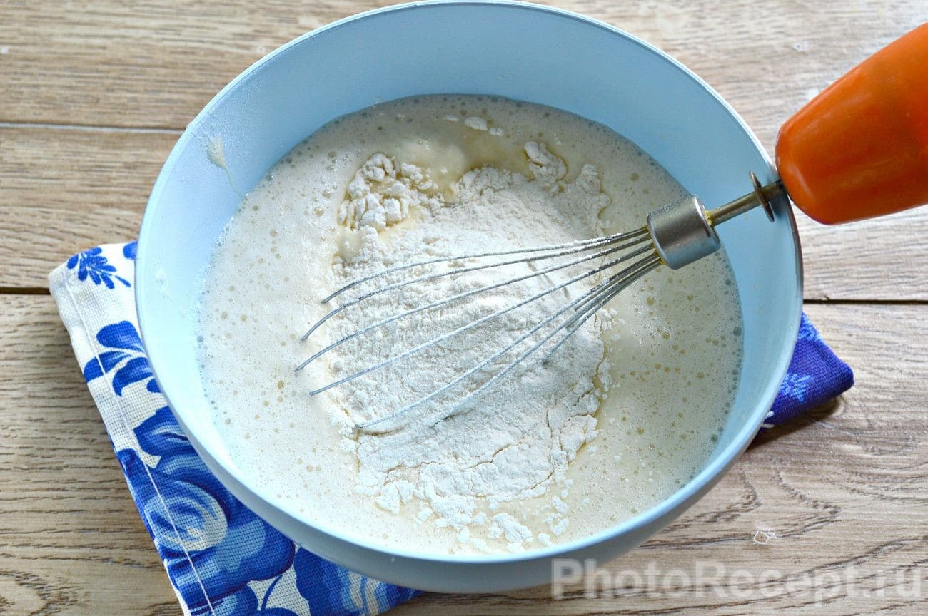 - Добавьте в тесто белковую пену, разрыхлитель и подсолнечное масло.