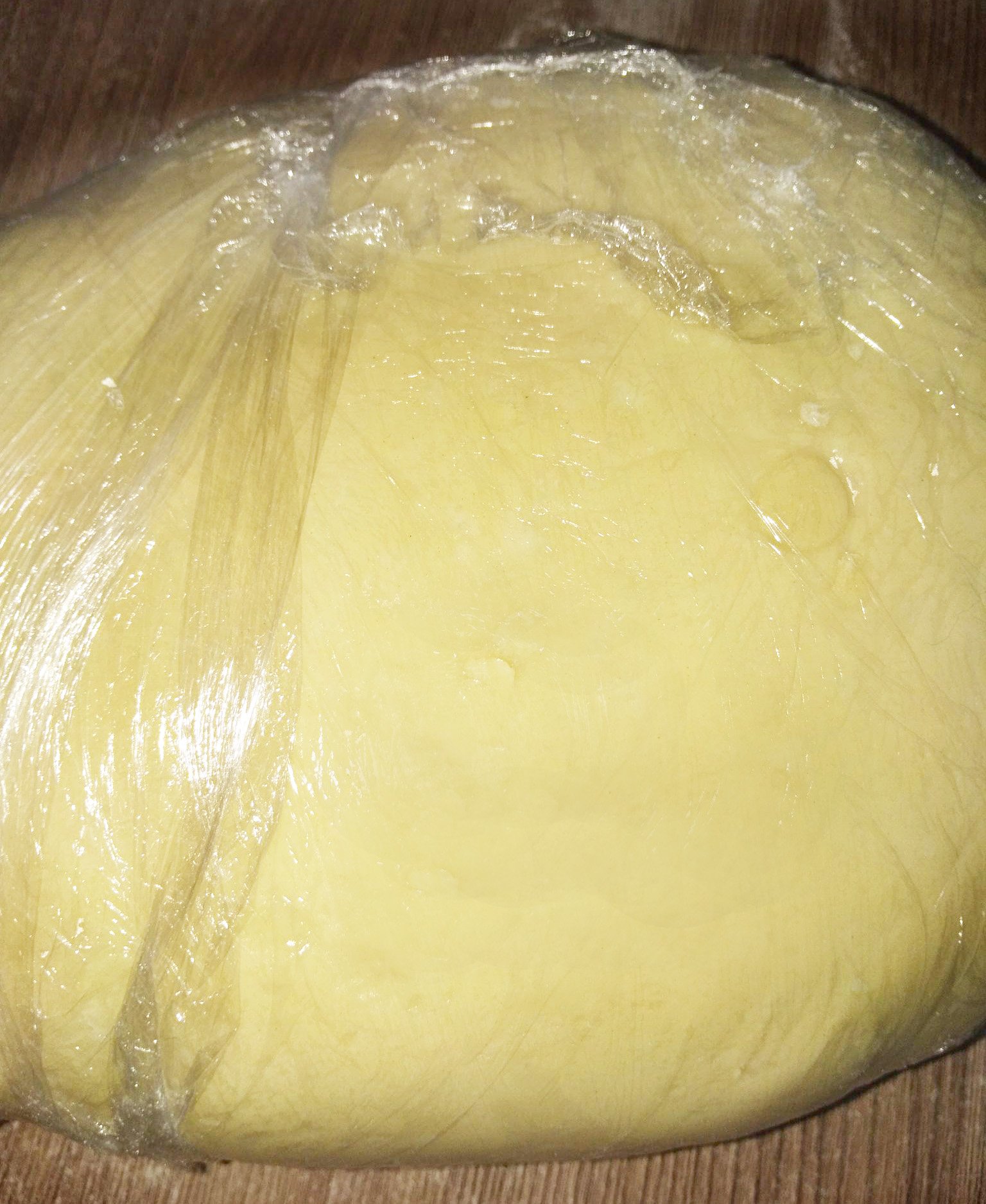 После вымешивания тесто нужно завернуть в пищевую пленку и отправить отдыхать в холодильник, не меньше, чем на час, но лучше – на полтора.