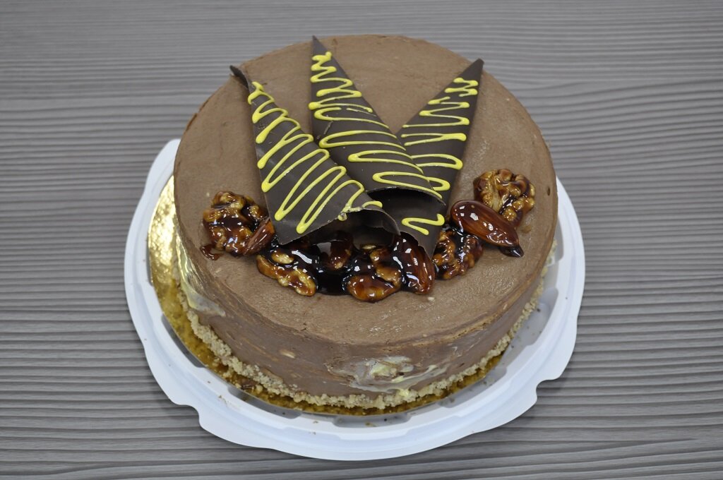 Торт Фрамбуазье с малиновым конфи и кремом из маскарпоне с фисташкой, тарт Экстра с легкой карамелью с fleur de sel и саблированным фундуком