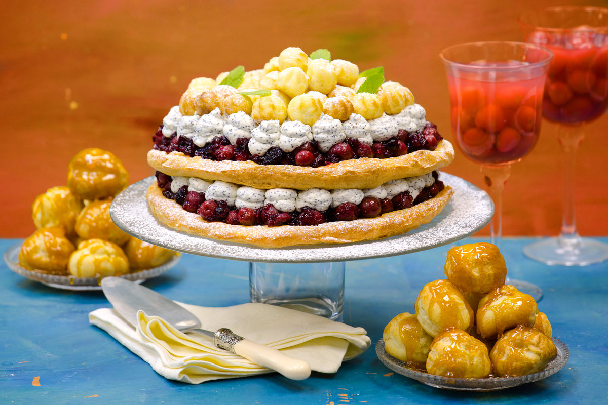 Есть много небольших вариантов этого. Например, вы можете карамелизовать сахар и окунуть нижнюю и верхнюю части слоек в сахар, а затем прикрепить их к пирогу.На этот раз я решил не возиться с горячей карамелью и решил использовать сливки для взбивания. Пока я исследовал этот торт, я также заметил, что в некоторых рецептах слойки с кремом не заправлялись кремом шибустом, а в других — так. Здесь слойки заполнены, и я рекомендую сделать это вместо того, чтобы оставить их незаполненными, потому что это просто добавляет невероятного декаданса. Еще я использовала несколько ягод малины из холодильника, чтобы украсить торт. Этот последний штрих стал не только визуальным праздником, но и придал пирогу чудесный фруктовый и терпкий вкус.