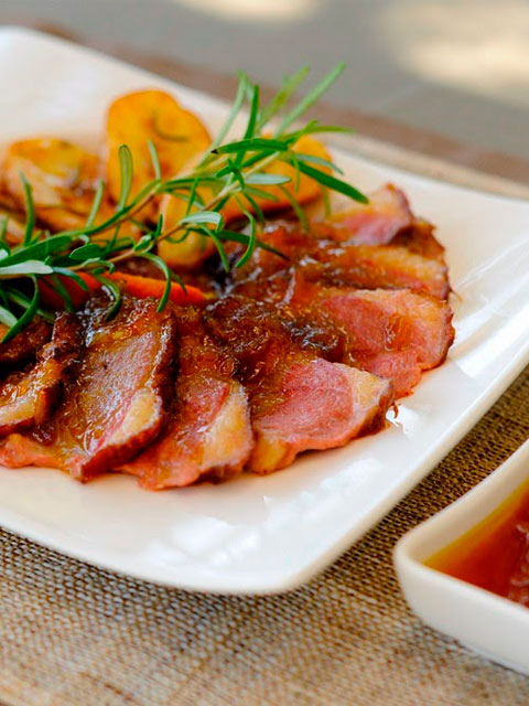 - Запечённые утиные грудки, поливаем апельсиновой карамелью, украшаем кусочками апельсина. Подаём к столу с отварным рисом и овощами.
