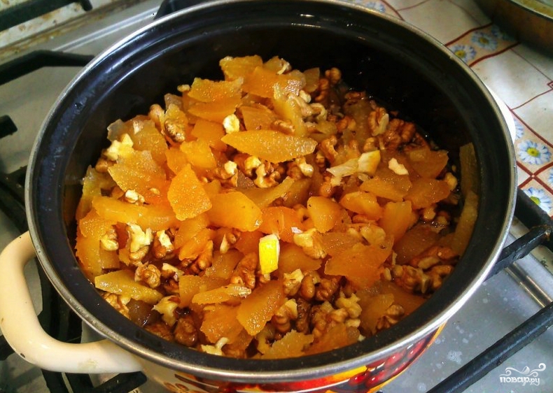 4. Переложить в сладкую жидкость измельченную фруктовую массу и довести до кипения. Убавить огонь до минимального и варить 10-15 минут. Затем всыпать грецкие орешки и уваривать смесь до тех пор, пока фруктовая стружка не станет сладкой и мягкой.