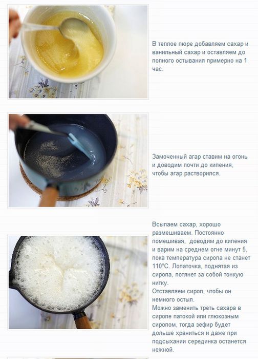 В это же время нужно смешать 50 граммов сахарного песка с агар-агаром (8 граммов). В небольшую емкость следует налить воду и насыпать туда 350 граммов сахара. Жидкость доводят до температуры 80 градусов на среднем огне. Пока сироп варится, яблочное пюре нужно тщательно взбить вместе с белком до образования густой белой массы. Одновременно добавьте агар-агар к горячему сиропу, при этом все перемешивая.