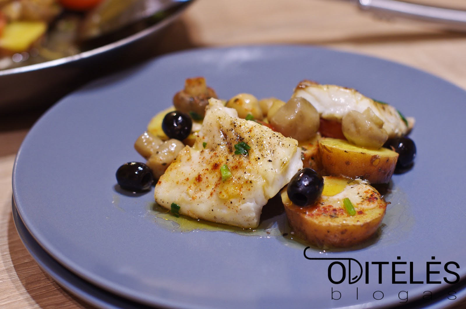 Выложи в форму лук, картофель и треску, приправь, полей 2 ст.л. молока и положи по кусочку сливочного масла. Запекай 15-20 минут при 180 градусах. Подавай блюдо с маслинами и вареными яйцами.
