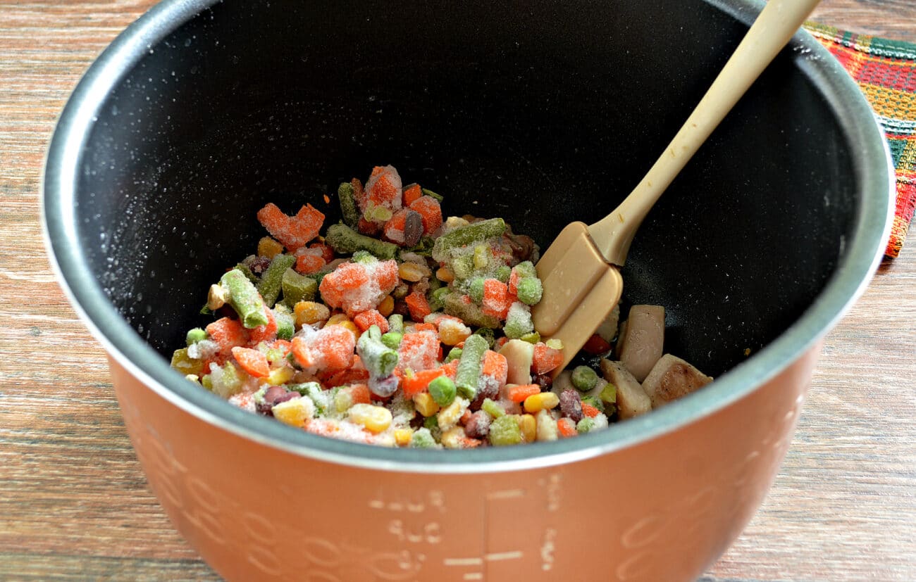 - Положите твердые овощи (коренья, картофель) на дно мультиварки. Никогда не кладите замороженные продукты прямо в мультиварку; это может усилить болезнь пищевого происхождения.