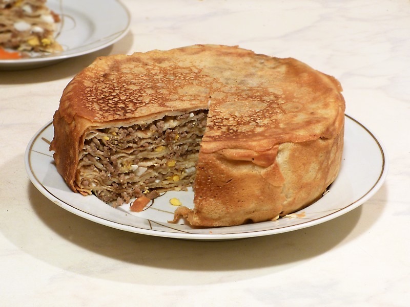 Каждый слой начинки перекладываем блинчиком. Блины готовят по любому известному рецепту, на дрожжах или пресно. Для курика нужно испечь девять блинов.