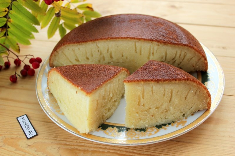Выпекать такой манник лучше в керамической или стеклянной форме с низкими бортиками, так он поддастся ему, и сверху появится характерная трещинка.