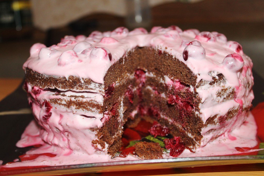 - Смажьте коржи и верх торта кремом. Можно украсить малиной или клубникой. Для этого торта подойдёт и сливочный крем – для него нужно взбить стакан сливок 33% жирности с двумя столовыми ложками сахара.