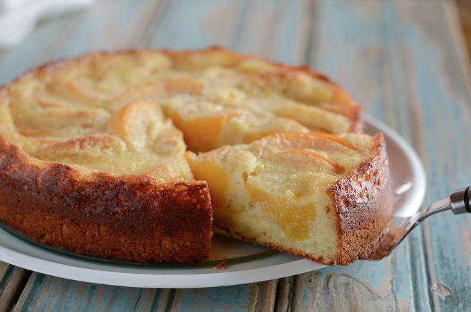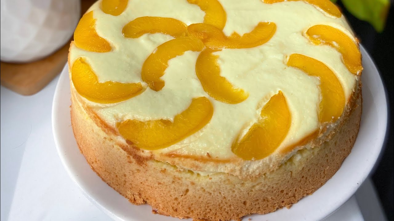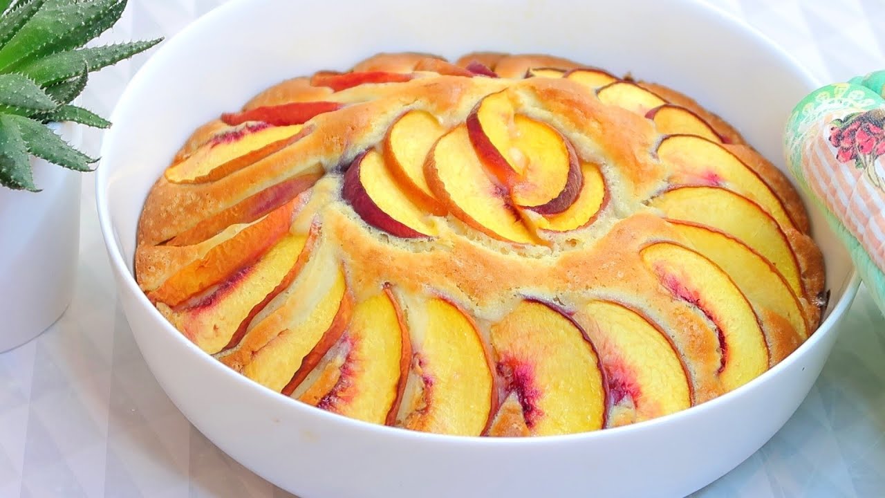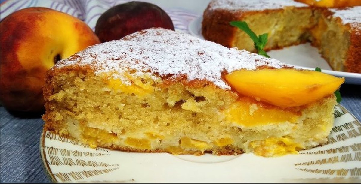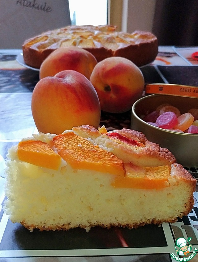 Мягкий и сочный пирог с консервированными персиками на основе кефире