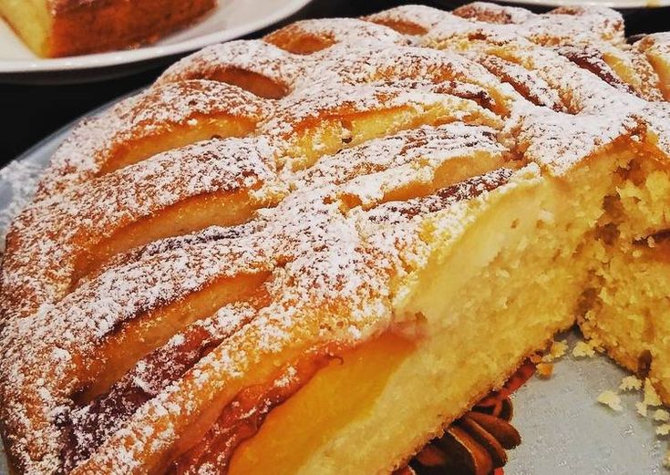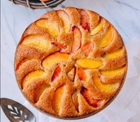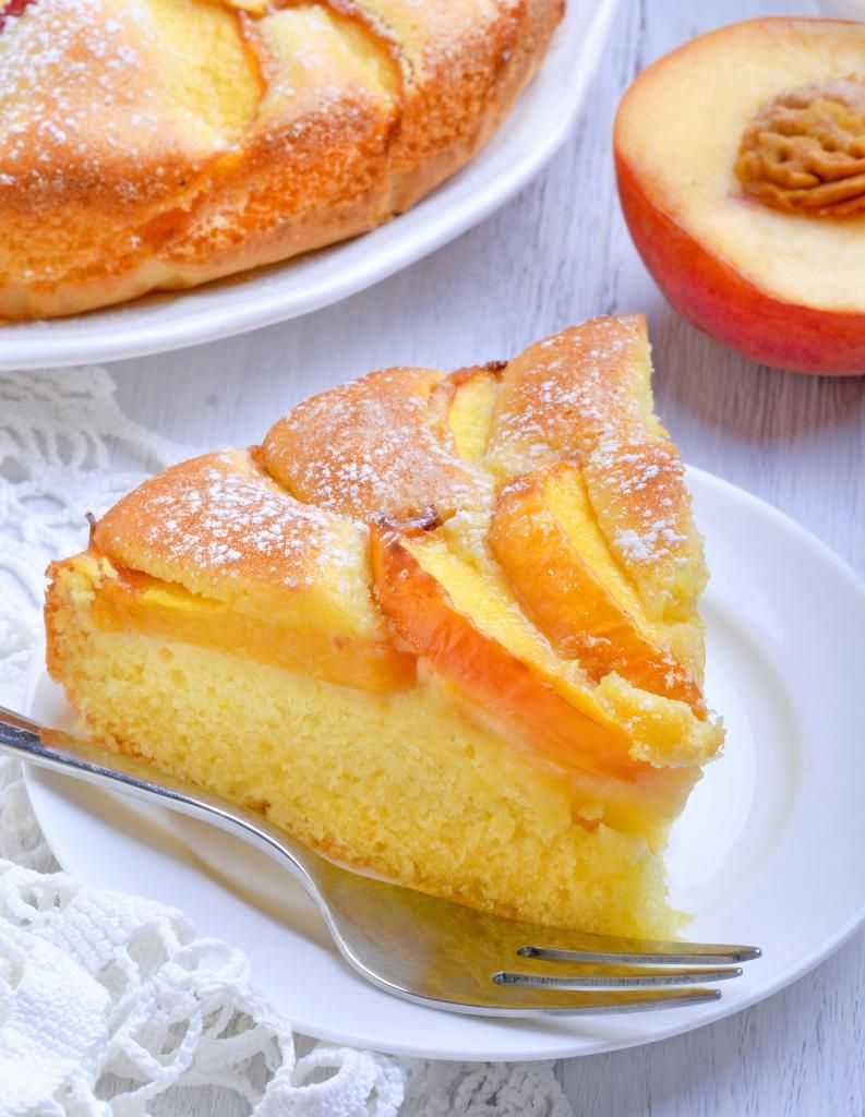 - Дайте персиковому пирогу немного остыть, затем нарежьте и подавайте.