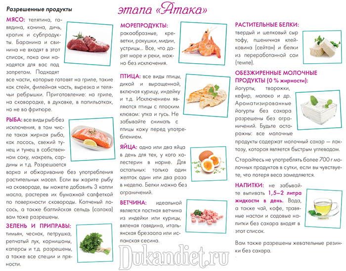 Атака: быстрая потеря веса. Дюкан категорически против голодания. Поэтому даже во время самого жесткого периода, есть возможность выбирать из 72 продуктов. Все они богаты белками, которые стимулируют процесс похудения. Причем, сжигаются именно жир, а мышцы остаются в целости и сохранности.