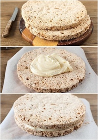 11Собираем торт: бисквитный коржик хорошо промазать кремом. Затем положить корж безе и также хорошо промазать кремом во всех сторон. Сверху посыпать торт оставшейся от бисквита крошкой.