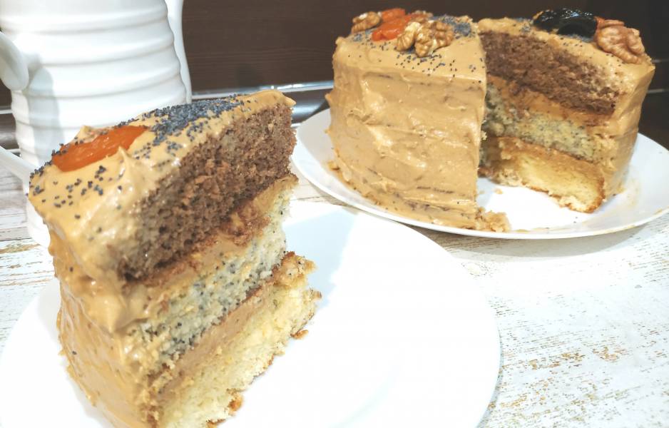 Мажьте этот корж кремом. Лучше всего использовать четверть крема. Выложите на этот корж второй, вторым будет маковый. Его также пропитайте сначала сиропом а потом и кремом. На этот корж выложите последний, конечно же из кураги. Все по старому, сироп, а потом крем. Вот и готов почти торт. Кремом необходимо смазать не только третий корж, но и бока тортика.