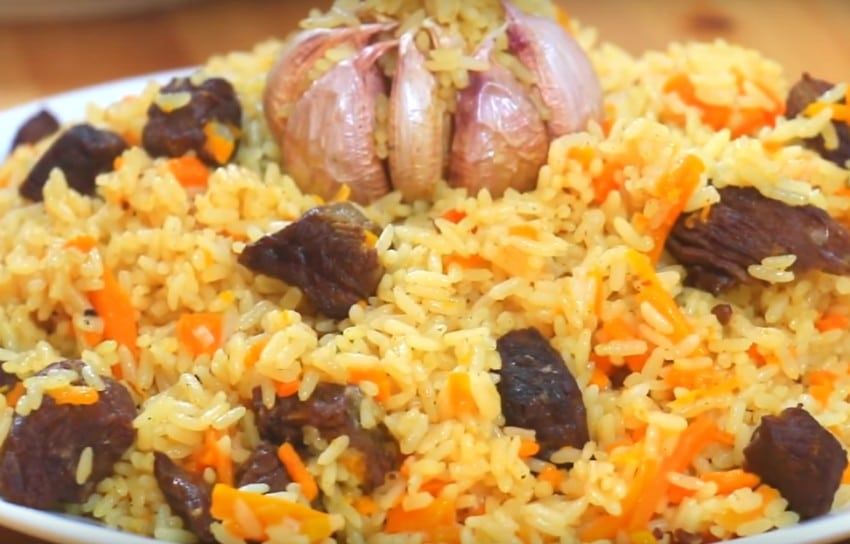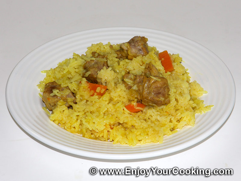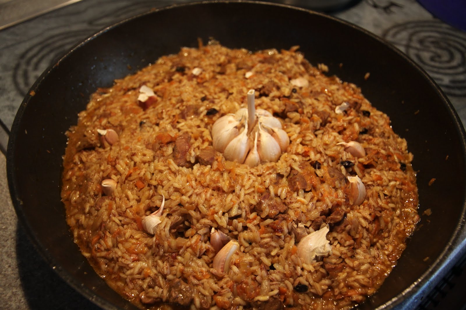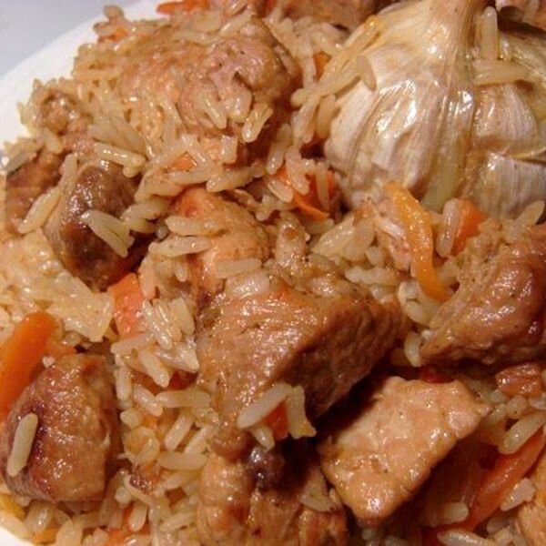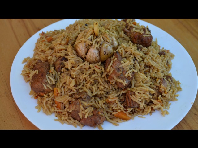 Тебе понадобится: 1,2 кг свинины, 1 кг риса лазер, 160 мл масла, 100 мл свиного бульона, 300 г лука, 1 кг моркови, 100 г перца чили, соль, зира, чеснок.