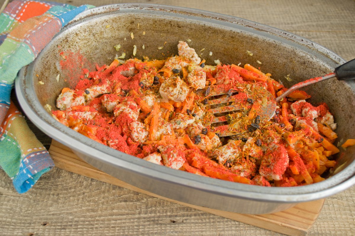 Нужно его выложить таким образом, чтобы он полностью закрыл мясо и морковь.