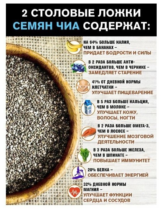 В столовой ложке семян чиа 60 калорий, 2 грамма белка, 4 грамма жира, 5 граммов клетчатки, 2,5 грамма жирных кислот Омега-3 и 90 миллиграммов кальция. Они также содержат фосфор, марганец, цинк и другие витамины и минералы.