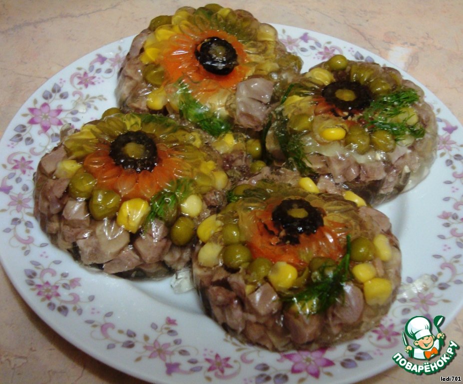 Сегодня хочу поделиться своим любимым рецептом заливного, которое состоит из говяжьего языка, консервированной кукурузы и горошка. Закуска получается невероятно яркой, праздничной и очень вкусной! …далее