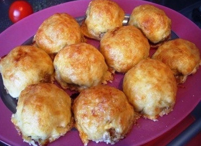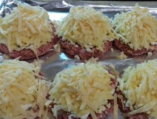 Переложил стожки из фарша на противень к уже сформированным заготовкам. Натер на крупной терке сыр, обильно посыпал, чтобы образовалась пышная шапочка.